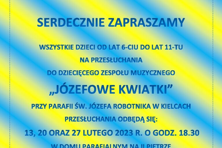 W trzy kolejne poniedziałki: 13, 20 oraz 27 lutego 2023 r. o godz. 18.30, w domu parafialnym na II piętrze odbędą się przesłuchania do Dziecięcego Zespołu Muzycznego „Józefowe Kwiatki”. Zapraszamy dzieci uzdolnione wokalnie od 6 do 11 roku życia.