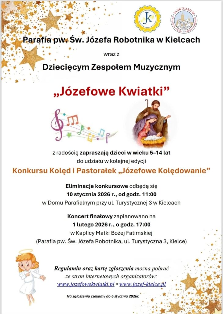 Parafia pw. św. Józefa Robotnika w Kielcach oraz Dziecięcy Zespół Muzyczny „Józefowe Kwiatki” serdecznie zapraszają dzieci w wieku 5 – 14 lat do udziału w V Konkursie Kolęd i Pastorałek „Józefowe Kolędowanie”.